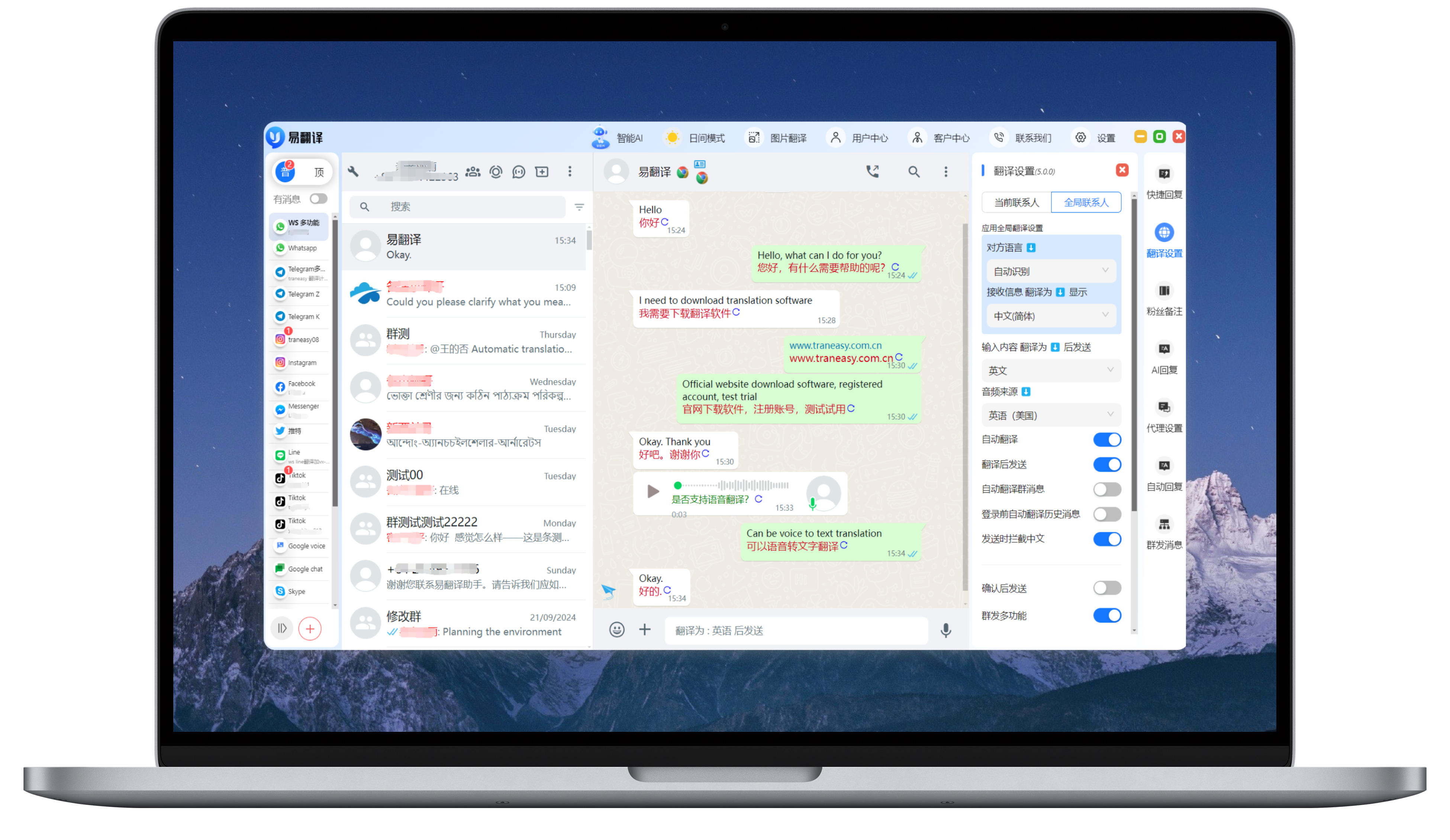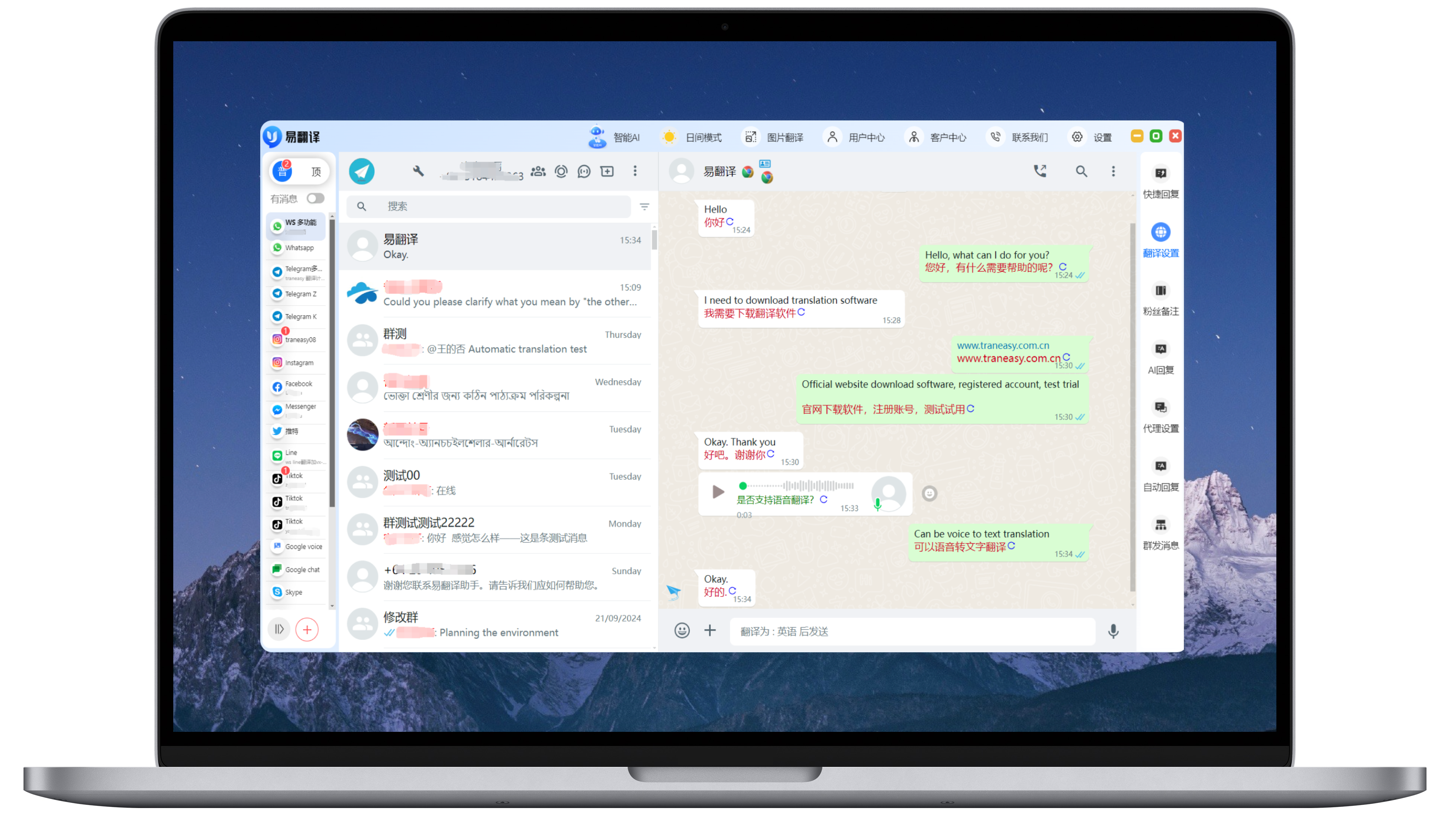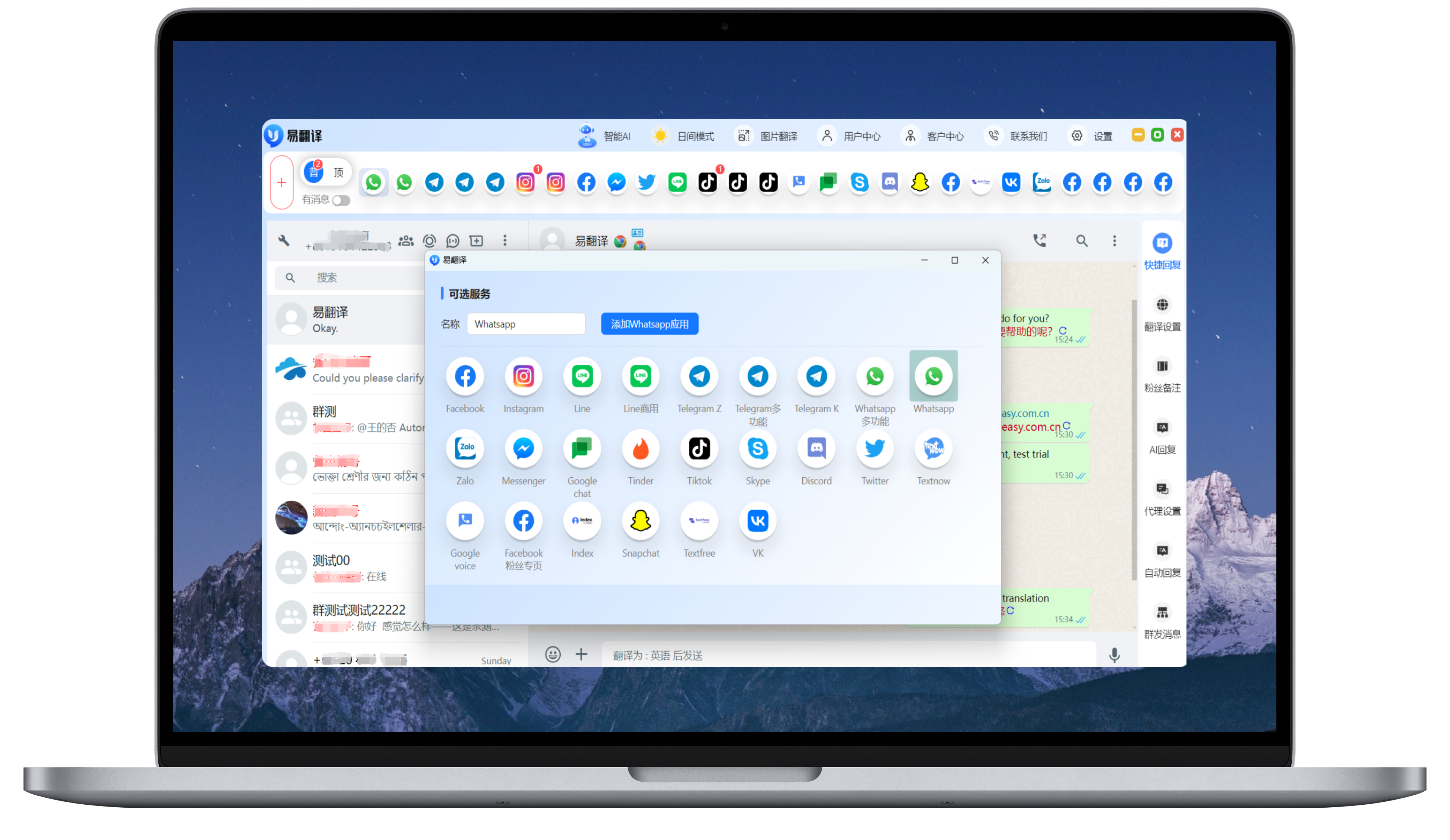 易翻译集成了whatsapp/line/zalo/telegram等全球主流社交软件